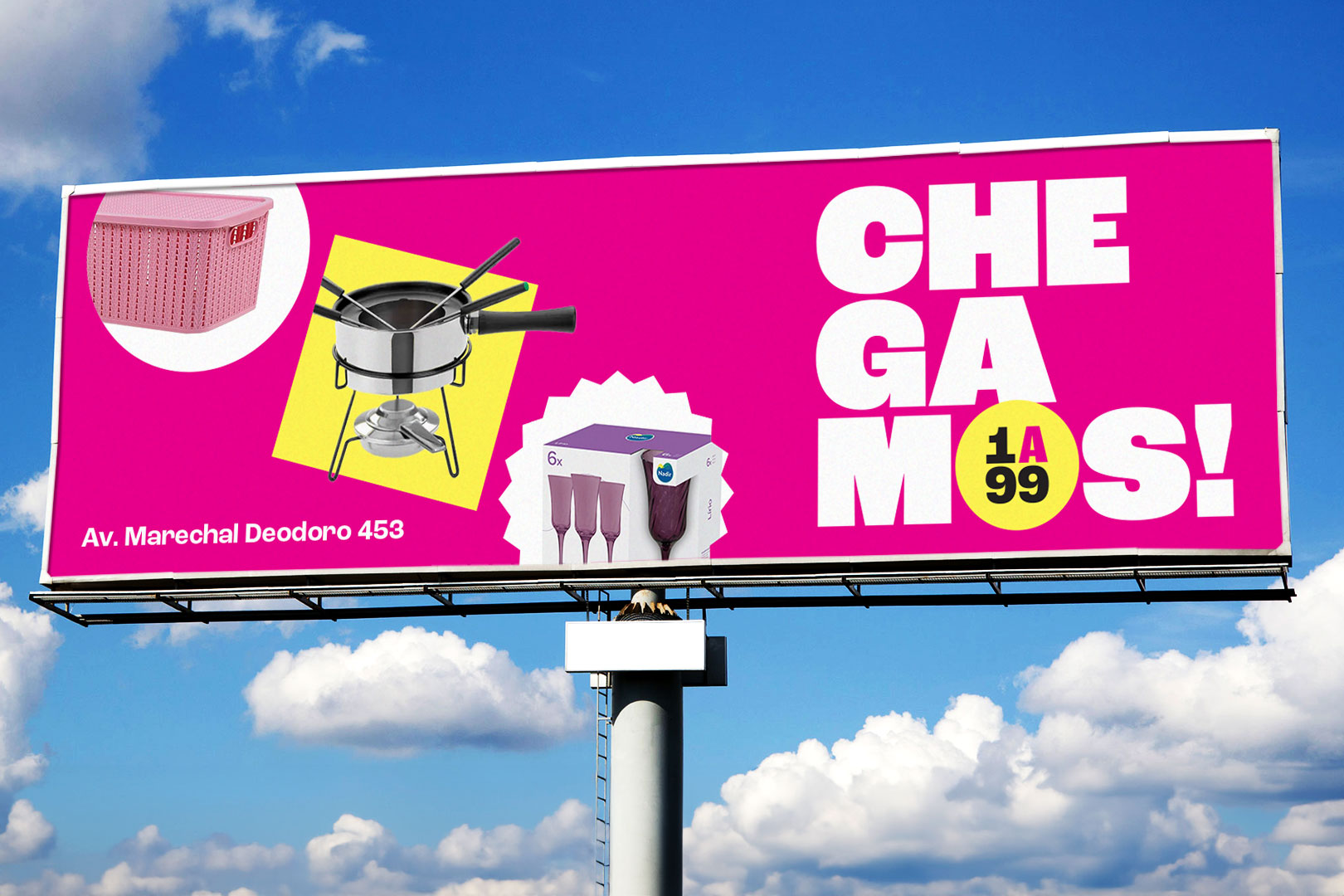 1a99 is one of the biggest "1 real" stores in São Paulo. The "A" in the middle of the name is a wordplay, and sets them apart from all other stores. I created a new, bold and colorfull brand identity to help them pivot in a new direction of growth.